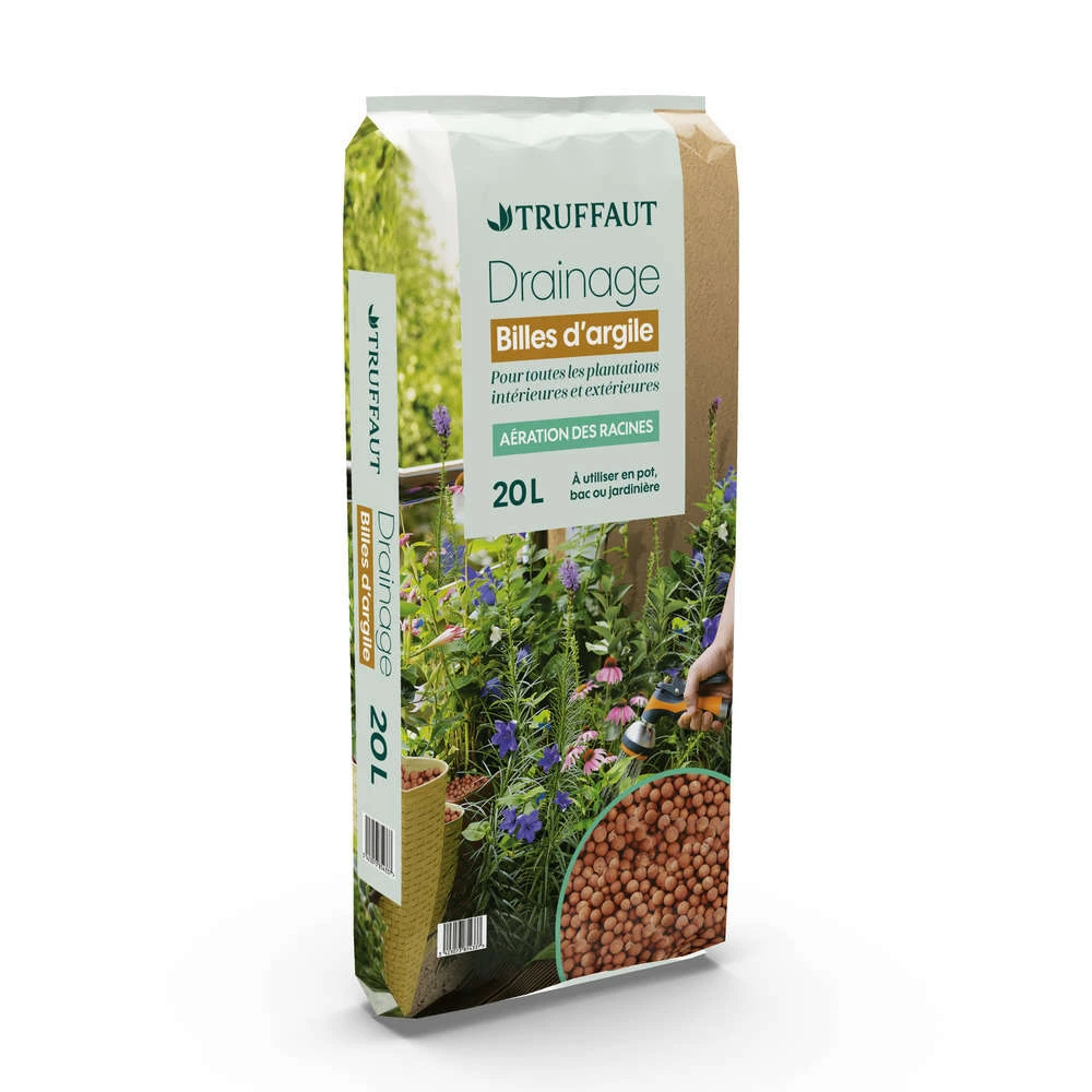 Ces billes d’argile vous permettront de bichonner vos plantes en créant des couches drainantes. Ces dernières auront pour effet d’éviter l’accumulation d’eau dans les pots qui provoque l’asphyxie des racines et le développement des maladies. Ce substrat 100% minéral pourra également être utilisé pour le rempotage, il permettra alors le développement des racines. Utilisé pour la décoration, il constituera un surfaçage original. Vos plantes seront belles et saines, que demander de plus?.Ces billes d’argile sont vendues en sac de 20 litres.