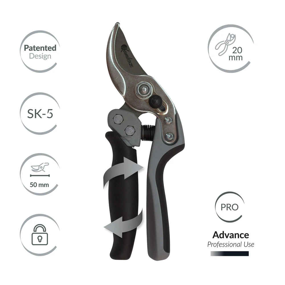 KM1-mr Sécateur Professionnel 20mm ø. Acier Trempé Sk-5. Poignée Rotative. Ciseaux De Jardinage. Ciseaux Courbes.