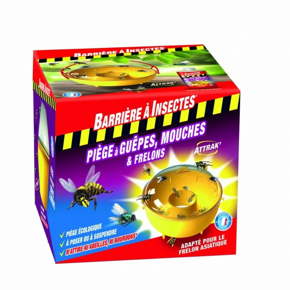 piège attirant et piègeant les guêpes, frelons, mouches et moucherons à l’extérieur, dans votre jardin ou sur votre terrasse, aux abords d’une piscine ou dans un verger. A utiliser avec notre attractif concentré très puissant. Piège à entrée centrale par le dessous du piège adapté au vol de la guêpe. Discret, il posséde une grande capacité de piégeage. Ecologique et réutilisable. Se pose ou se suspend grâce au lien intégré. Préserve abeilles et bourdons.