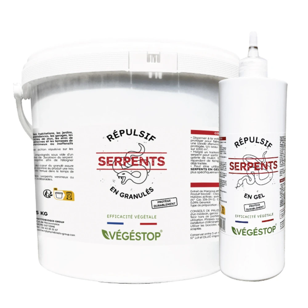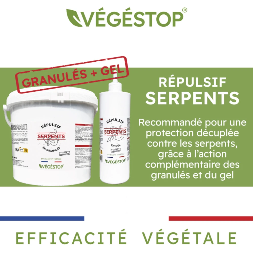 Les répulsifs serpents en granulés et en gel vegestop sont recommandés pour préserver les habitations, les jardins, les vergers, les rocailles, les dépendances, les garages, les greniers, les abris à bois, les aires de jeux, les aires de pique-nique, les campings, les piscines et les terrasses de la présence de serpents, venimeux ou inoffensifs (couleuvres, vipères, etc). Les granulés de céréales sont imprégnés sous vide d’un principe actif qui perturbe l’organe de jacobson du serpent. Cet organe programme le reptile afin de l’éloigner durablement de la zone traitée. L’imprégnation du principe actif au cœur du granulé assure une diffusion lente et continue qui confère au produit une très bonne efficacité et une excellente tenue dans le temps de l’effet répulsif. Les répulsifs serpents en granulés et en gel vegestop sont conçus pour éloigner les serpents venimeux ou inoffensifs des endroits où ils sont indésirables.