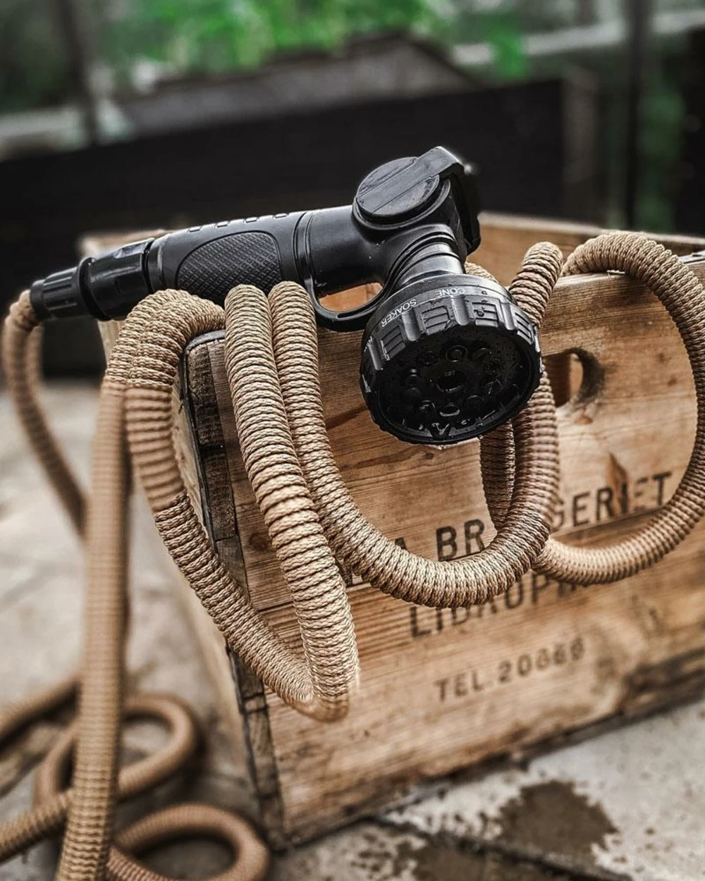 Jeu de tuyaux deluxe 25m, pistolet exclusif avec 7 programmes, support de tuyau en métal mat, sac en velours.